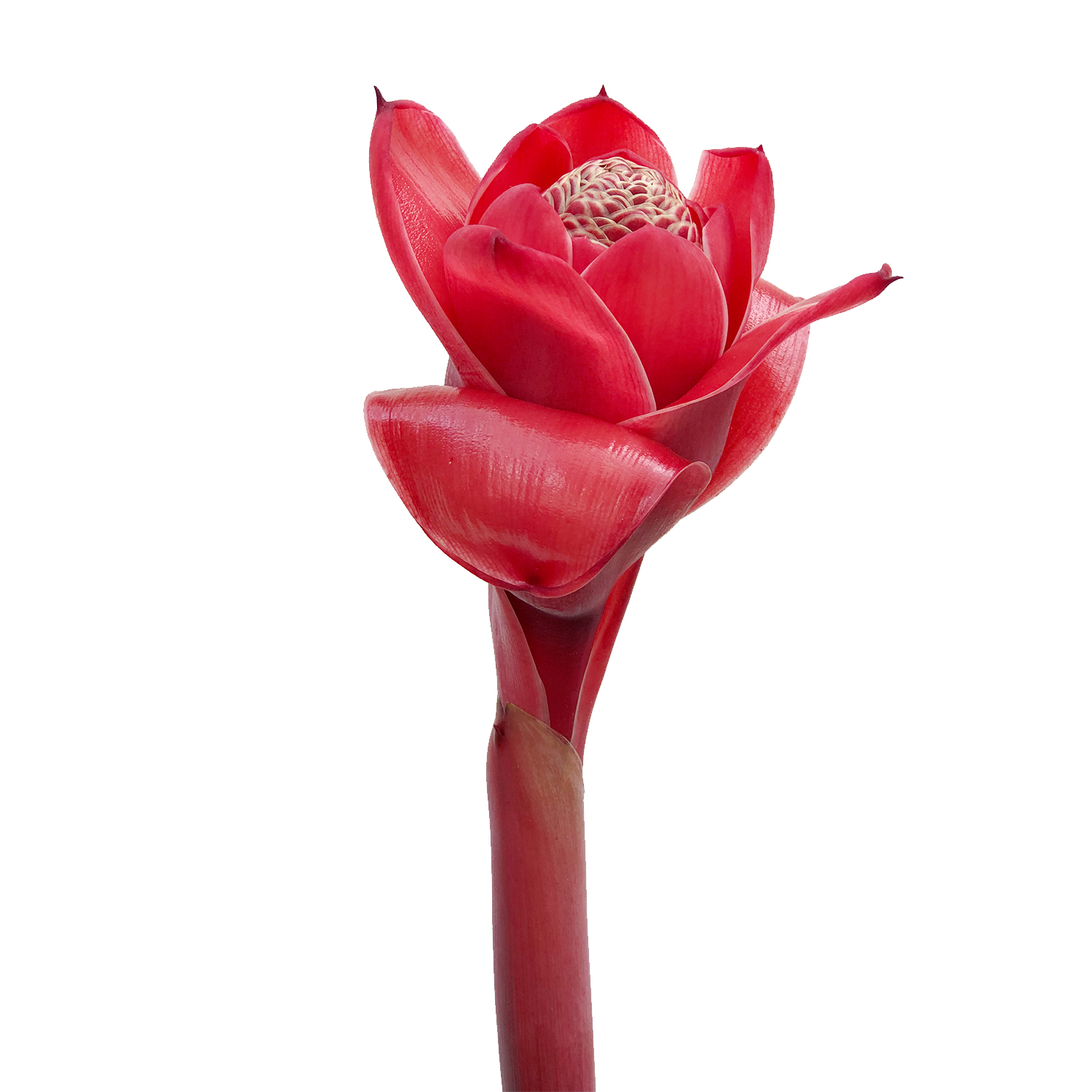 Torch ginger has a rhizome root system. XL White Torch Ginger Plant etlingera elatior Pure White Long flower stems rise 3 to 4 feet and are topped by bright white petal-like bracts where small yellow flowers emerge from among leaf stems. Pink ginger bud Engl Phaoemeria speciosa Blume Koord.